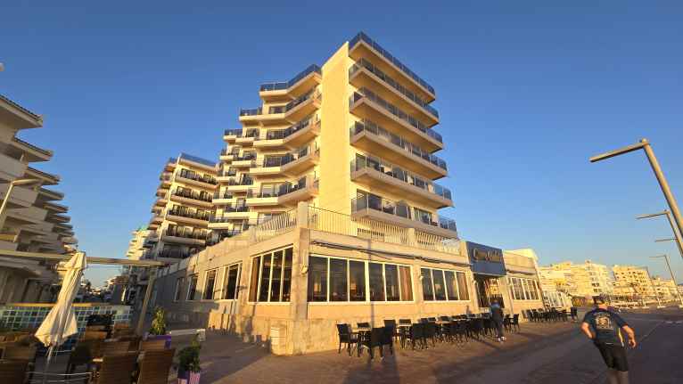 Ich frage beim Check-in und bekomme ein schönes Zimmer ganz vorne an der Waterfront. Vom Balkon sehe ich direkt auf die Strandpromenade runter und im Bett liegend das Meer. Also nix mit dem angekündigten „seitlichen Meerblick“. Schön. Superschön! Freue mich. Aussicht ist mir immer sooo wichtig!