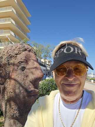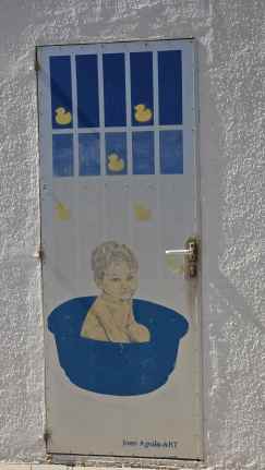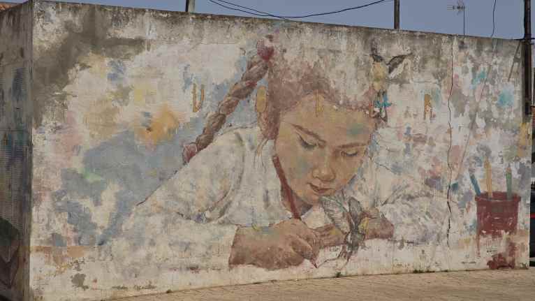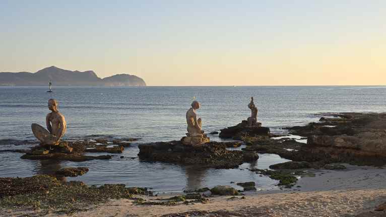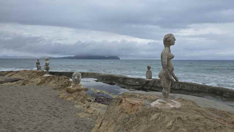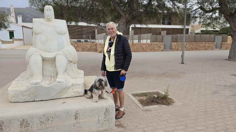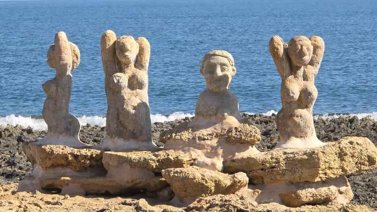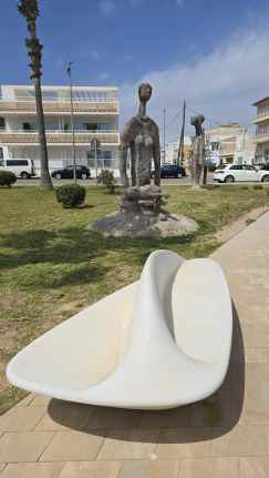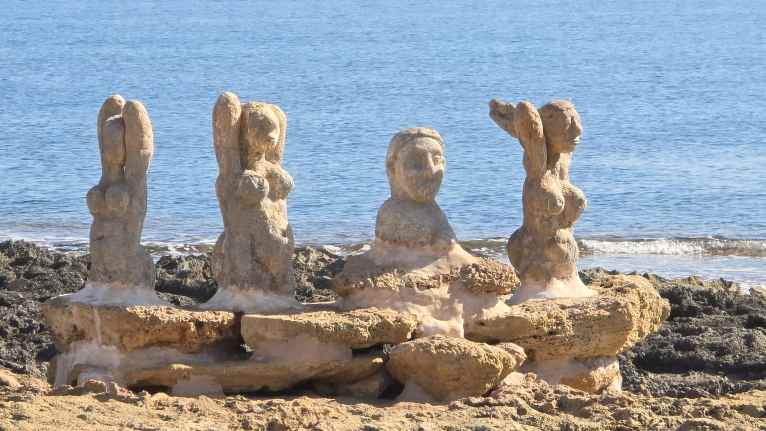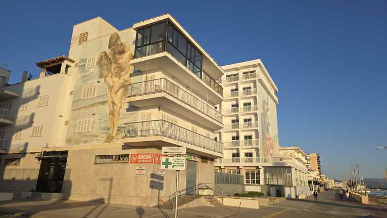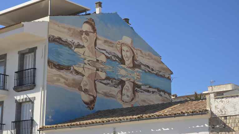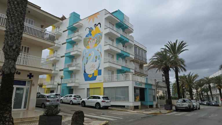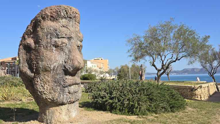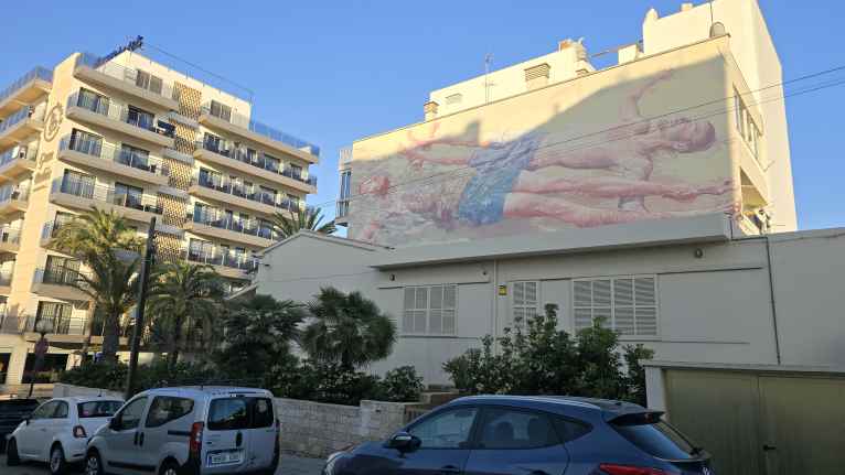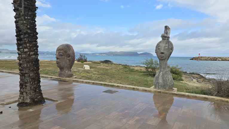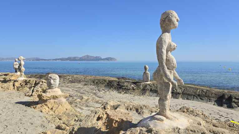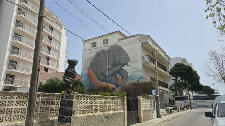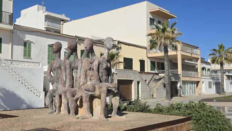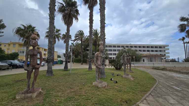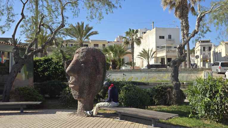 Solche „hässlichen“ Figuren von Joan Bennàssar gibt es oft im Ort. (Offiziell sind es „Kultur- und Kunstelemente“.) Sehr viele. Sehr hässsslich. Wandgemälde auch.