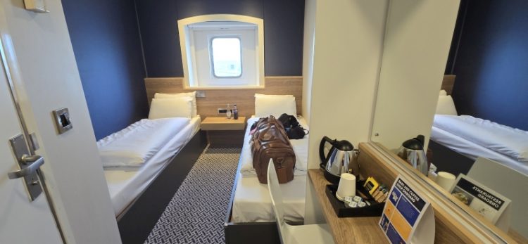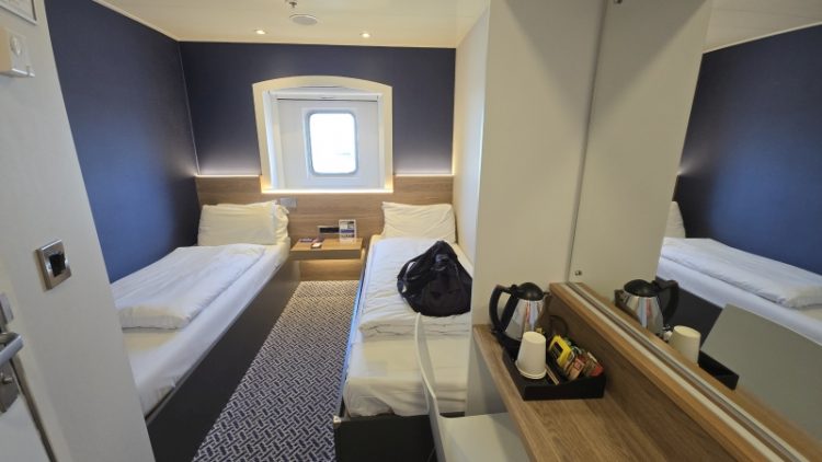 Meine Kabine ist besser als erwartet/befürchtet: zwei kurze schmale Betten, kleines Bad mit Dusche und Toilette, Fenster, alles sauber und ordentlich.