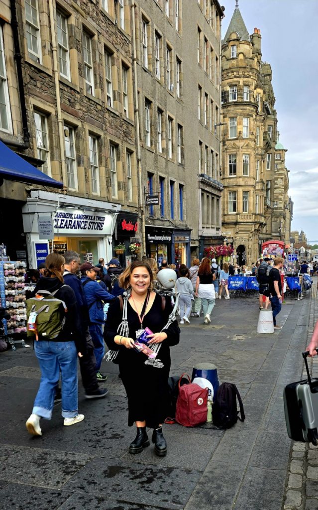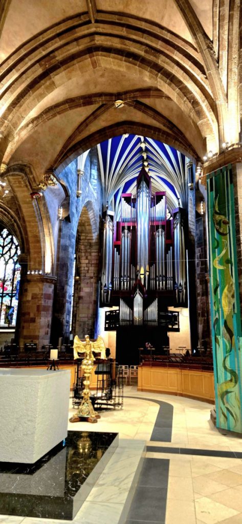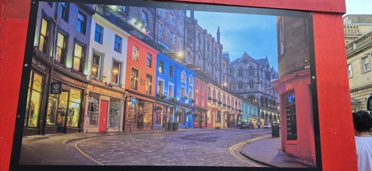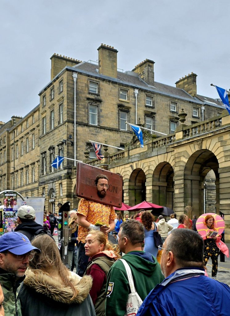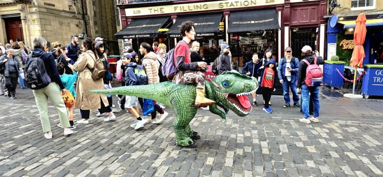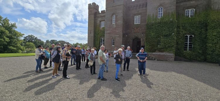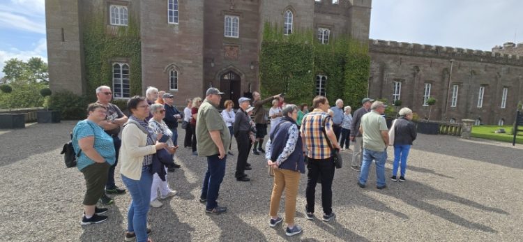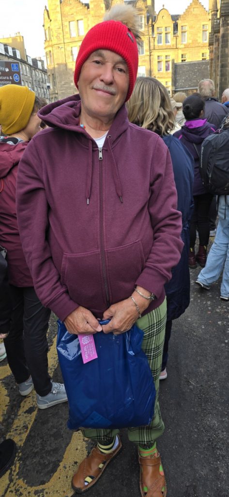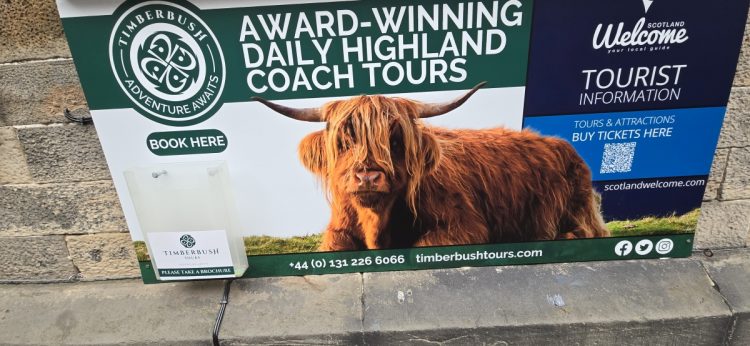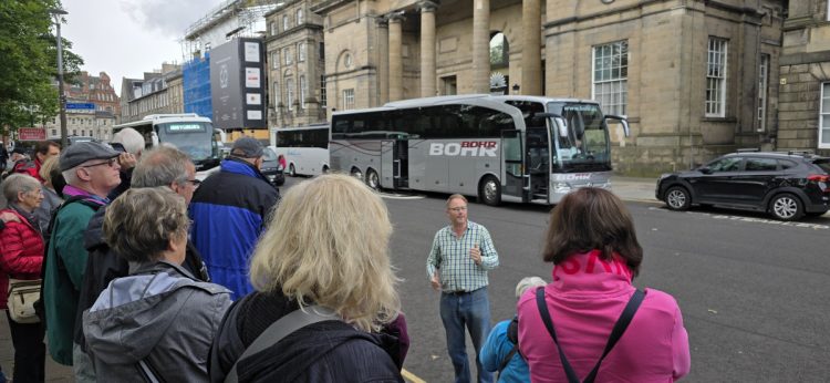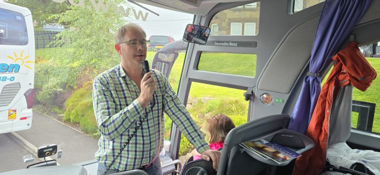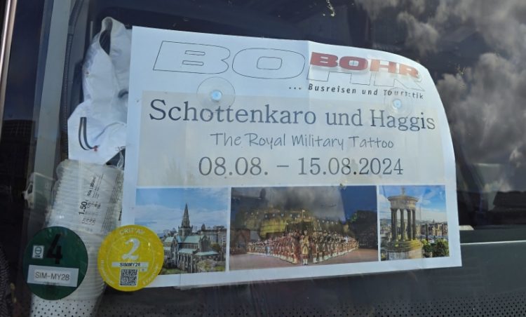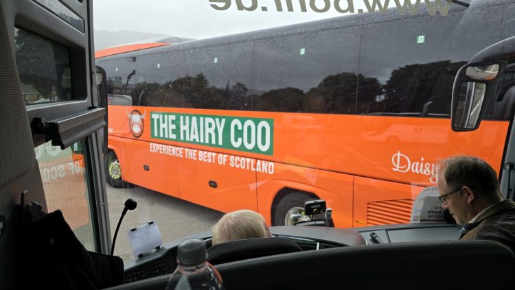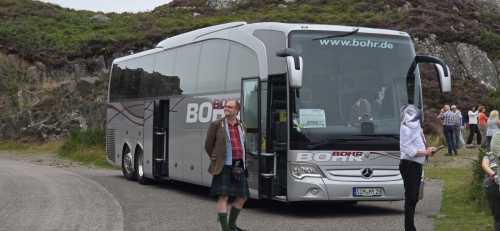 Am nächsten Morgen begrüßt uns ein neues Gesicht: Unser Reiseführer Hauke W. – stilecht im Tartan-Kilt. Tartan ist ein besonderes Webmuster für Stoffe, um seit 1815 die Zugehörigkeit zu einem schottischen Clan zu zeigen. Jeder Clan hat ein eigenes Karomuster. Es gibt über fünfzehntausend verschiedene Tartan-Muster, und es kommen immer noch ständig neue hinzu. Das weltweit erste Farbfoto zeigte übrigens das Muster eines Schottenrocks. Hauke wird uns auf unserer gesamten Reise durch Schottland begleiten. Solange er bei uns ist, sitzt Eva oft neben mir. Oder unten neben Hauke. Dann hab ich meine Sitzbank komplett für mich.