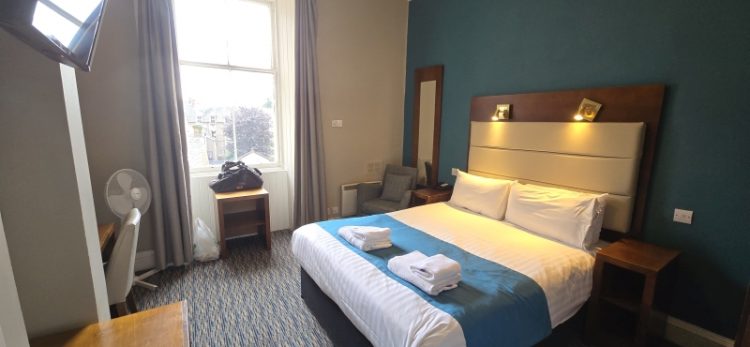 Nach einer kurzen Stadtdurchfahrt kommen wir im Vorort Clydebank und an unserem Hotel „The Golden Jubilee“ an, direkt neben dem gleichnamigen Krankenhaus am Clyde River. Ein wahrhaft riesiger Komplex. Mein Zimmer ist okay, und ich habe einen angenehmen Blick auf den Fluss. In der Ferne erkenne ich die Erskine-Bridge. Innenpool gäbe es auch, bin aber etwas zu müde dafür. Auf jeden Fall, für den Anfang nicht schlecht! Nice.
